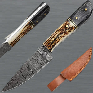 Experience unmatched performance with this Custom Handmade Damascus Hunting Knife Fixed Blade. Forged from Damascus steel, the blade showcases beautiful layered patterns while delivering razor-sharp precision and excellent edge retention. Its full-tang fixed blade construction ensures superior strength, balance, and stability without weak moving parts. The ergonomic handle provides a secure and comfortable grip during extended use. Built for durability, this knife handles field dressing, skinning, camping, survival tasks, and heavy-duty cutting with ease. A perfect blend of craftsmanship, reliability, and rugged functionality for every outdoor adventure and collection. Explore our Folding Knives collection today and upgrade your gear with confidence.