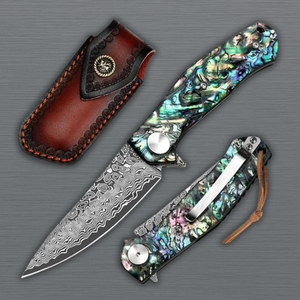 Elevate your everyday carry with the Damascus VG10 Folding Knife With Clip & Sheath. This masterpiece features a stunning 76-layer Damascus blade with high-performance VG10 steel core, delivering razor-sharp precision and exceptional edge retention. Measuring 7.52 inches overall with a 3.23-inch blade and 4.33-inch handle, it offers perfect balance for comfortable use. The polished natural abalone seashell handle creates breathtaking iridescent beauty, making each knife uniquely stunning. Includes convenient pocket clip and protective sheath for safe everyday carry. Perfect for collectors, outdoor enthusiasts, and gifting. Order now and explore our complete Folding Knives collection for more premium Damascus designs today.
