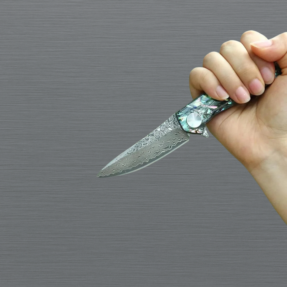 Keep blade clean and dry after use. Apply light oil periodically to preserve Damascus pattern. Wipe abalone handle gently with soft cloth to maintain iridescent shine.