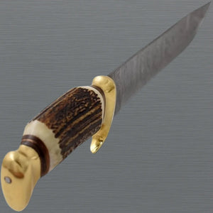 The blade is made from Damascus steel with distinctive layered patterns, offering exceptional sharpness, superior edge retention, and reliable strength for hunting tasks.